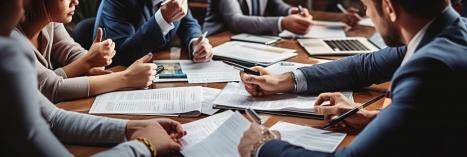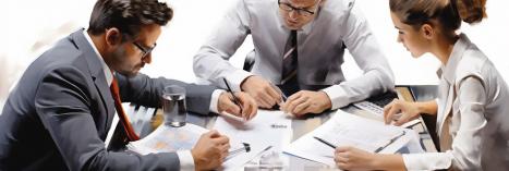 Team arbeitet gemeinsam an Dokumenten, um fundierte Entscheidungen und strategische Lösungen zu entwickeln.